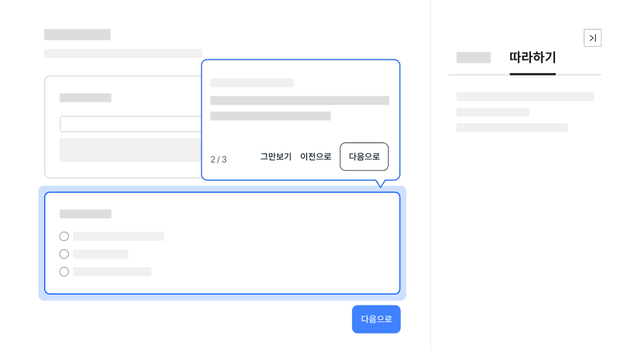모든 단계에서 액션 버튼은 왼쪽부터 ’그만보기’, ‘이전’, ‘다음’ 순서로 제공한다.