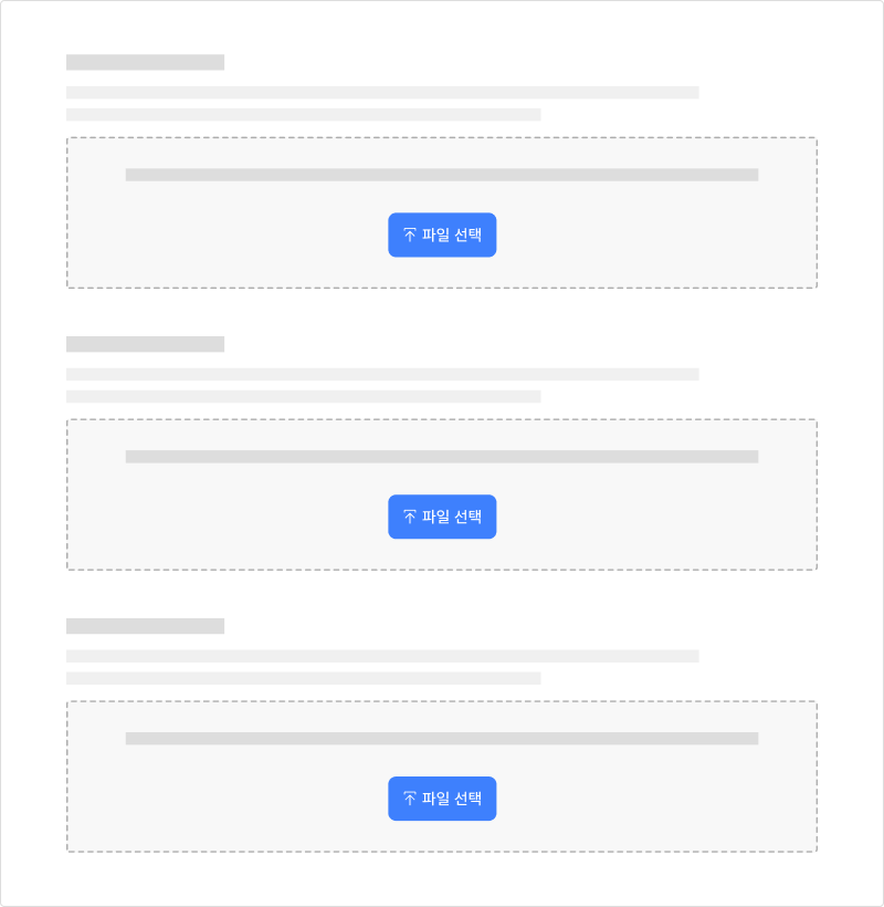 1개 파일의 업로드만 필요하거나 서로 관련이 없는 여러 개의 파일을 업로드해야 할 경우에 사용한다. 서로 관련 없는 파일은 섹션을 명확하게 구분하고 각 파일에 대해 개별적인 파일 업로드 컴포넌트를 제공하는 것이 적절하다.