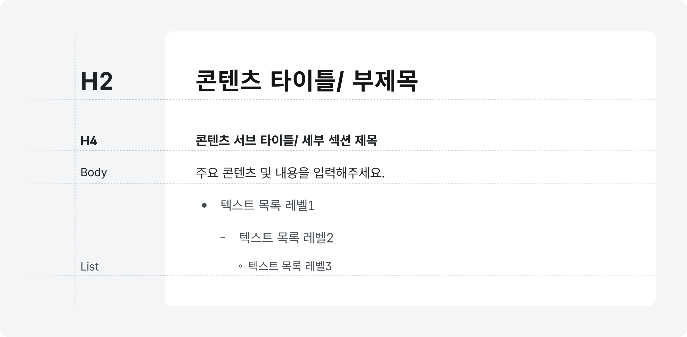 | h4 | small-xsmall | 본문과 비슷한 크기의 제목으로, 세부적인 콘텐츠에 대한 설명에 사용한다. |